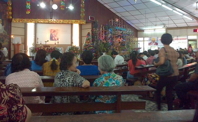 PERSIAPAN MISA - Ratusan umat Katolik di Gereja Ratu Pencinta Damai (MRPD) Jl Pancasila bersiap mengikuti Misa Natal pukul 08.00 WIB, Rabu (25/12/2013).