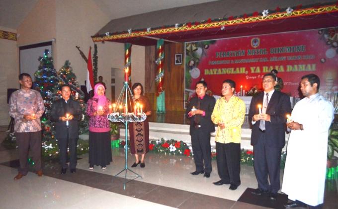 TRIBUNPONTIANAK.CO.ID, MELAWI - Ratusan umat kristiani menghadiri perayaan natal oikumene tahun 2013, Sabtu (28/12) malam di pendopo rumah dinas jabatan bupati Melawi. Kegiatan yang bertemakan “Datanglah, Ya raja damai” itu digelar pemkab Melawi.