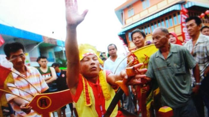 TRIBUNPONTIANAK.CO.ID, SINGKAWANG - Sejak pagi dari pukul 07.00 WIB para tatung sudah memulai ritual cuci jalan. Tampak bergiliran para tatung bersembahyang di Vihara Tri Dharma Bumi Raya yang berada di pusat kota Singkawang, Minggu (21/2/2016).