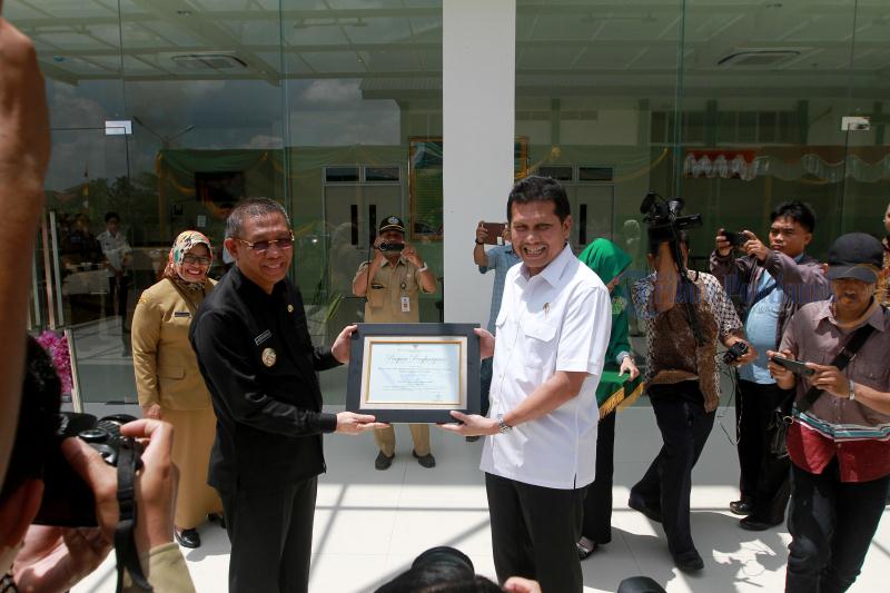 Piagam penghargaan diberikan kepada RSUD Sultan Syarif Mohamad Alkadrie (SSMA) sebagai Role Model Penyelenggara Pelayanan Publik Kategori Sangat Baik, yang diserahkan oleh Menteri Pendayagunaan Aparatur Negara dan Reformasi Birokrasi (PANRB), Asman Abnur kepada Walikota Pontianak, Sutarmidji,Selasa (14/3/2017). Pada kesempatan ini Asman Abnur juga meresmikan gedung Rawat Inap RSUD SSMA.TRIBUN PONTIANAK / ANESh VIDUKA