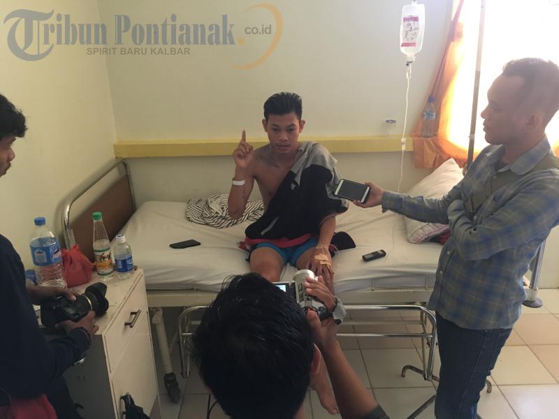 Damara Ramadhan Putra korban penyiraman air keras saat ditemui sejumlah wartawan di Ruang C RSUD dr Soedarso, Jalan dr Soedarso, Pontianak, Kalimantan Barat, Kamis (4/5/2017) pagi. Ia bersama temannya bernama Widya Suprapti menjadi korban penyiraman air keras oleh seorang yang diduga mantan pacar Widya, berinisial Hn di Jalan Imam Bonjol pada Rabu (3/5) malam. TRIBUN PONTIANAK/DESTRIADI YUNAS JUMASANI