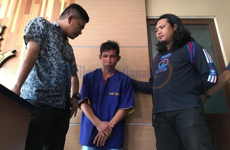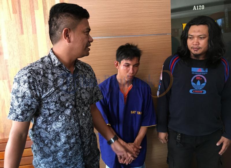 Ramadani (baju tahanan) pelaku tindakan asusila terhadap anak di bawah umur yang diamankan di Mapolresta Pontianak, Jalan Johan Idrus, Pontianak, Kalimantan Barat, Rabu (12/7/2017) siang. Ramadani melakukan tindakan asusilanya tersebut pada tahun 2012 lalu dan baru dilaporkan pada akhir bulan lalu. TRIBUN PONTIANAK/DESTRIADI YUNAS JUMASANI