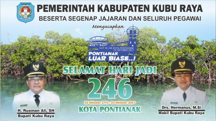 TRIBUNPONTIANAK.CO.ID, PONTIANAK - Pemerintah Kabupaten Kubu Raya H. Rusman Ali, SH Bupati Kubu Raya dan Drs. Hermanus, M.Si Wakil Bupati beserta segenap jajaran dan seluruh pegawai mengucapkan Selamat Hari Jadi Kota Pontianak ke 246 tahun (23 Oktober 1771 - 23 Oktober 2017).