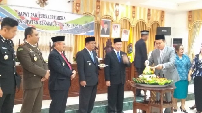 TRIBUNPONTIANAK.CO.ID, SEKADAU - Setelah digelar upacara peringatan HUT Kabupaten Sekadau di halaman kantor bupati, rangkaian peringatan HUT Kabupaten Sekadau ke 14 dilanjutkan ke ruang sidang DPRD Kabupaten Sekadau, Senin (18/12/2017).