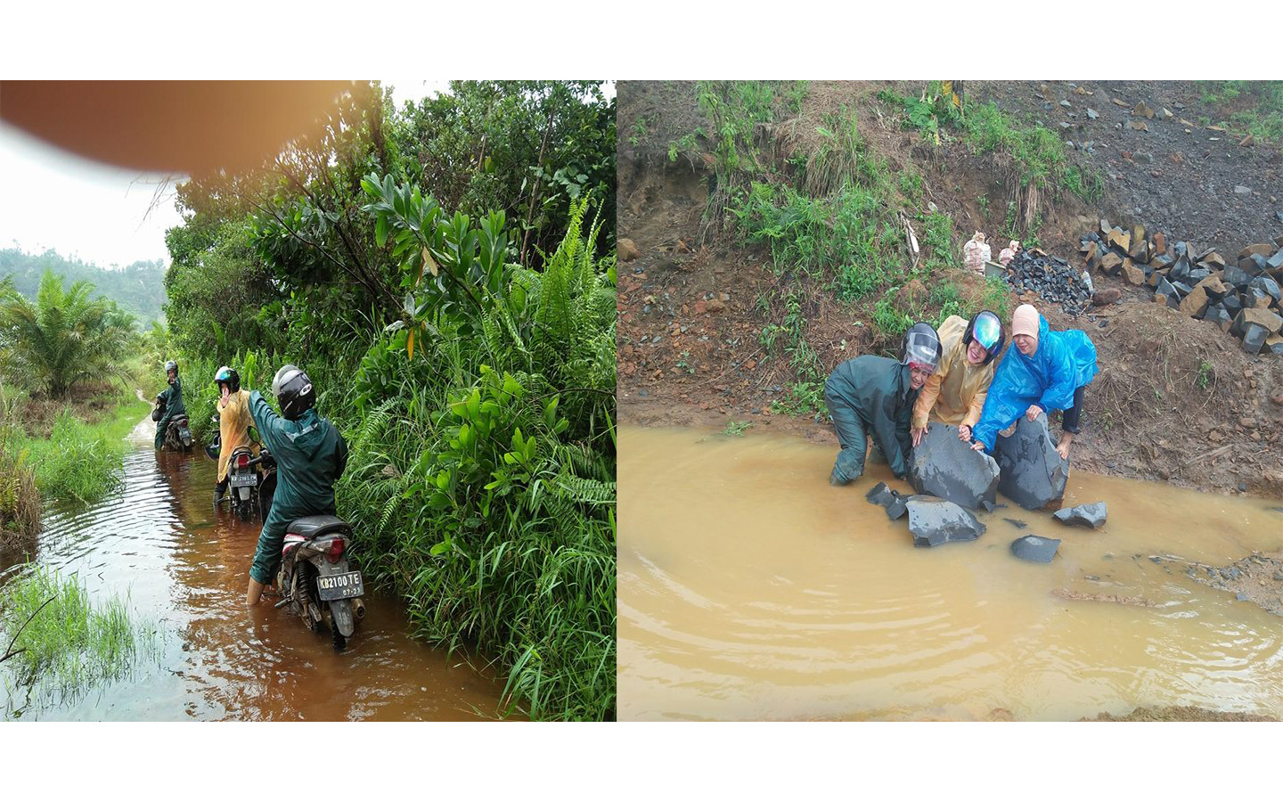 Bahkan beberapa dari mereka harus mengangkat batu hanya agar genangan yang dalam tadi bisa sedikit dilalui.