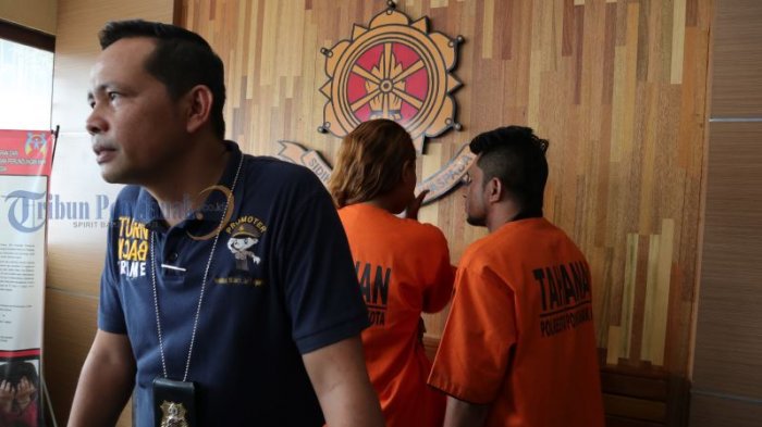 Sepasang suami istri yang ditahan di Mapolresta Pontianak, Jalan Johan Idrus, Pontianak, Kalimantan Barat, Kamis (1/3/2018) siang. Mereka ditahan karena kedapatan mencuri handphone pengunjung pasar malam di Pekan Promosi dan Kuliner Cap Go Meh 2569, pada Rabu malam. TRIBUN PONTIANAK/DESTRIADI YUNAS JUMASANI