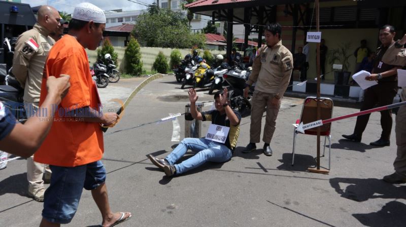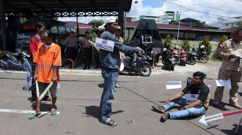 Rekonstruksi kasus menghilangkan nyawa orang yang dilakukan oleh tersangka Mt, Hl, Tf, dan Hr saat perkelahian di Pasar Flamboyan beberapa waktu lalu yang digelar di Mapolresta Pontianak, Jalan Johan Idrus, Pontianak, Kalimantan Barat, Kamis (8/3/2018) siang. TRIBUN PONTIANAK/DESTRIADI YUNAS JUMASANI