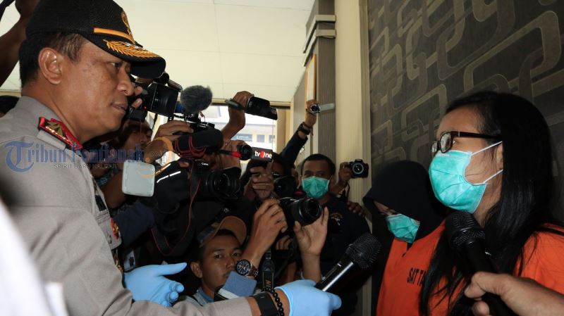 Kapolda Kalimantan Barat Irjen Didi Haryono saat berbicara kepada tersangka usai merilis kasus tindak pidana perdagangan orang dan tenaga kerja Indonesia ilegal di Mapolda Kalimantan Barat, Jalan Ahmad Yani, Pontianak, Kalimantan Barat, Kamis (22/3/2018) siang. Satu diantara kasus yang diungkap yaitu orangtua yang tega menggadai anaknya berumur empat bulan karena alasan membayar hutang judi sebesar Rp 2juta. TRIBUN PONTIANAK/DESTRIADI YUNAS JUMASANI