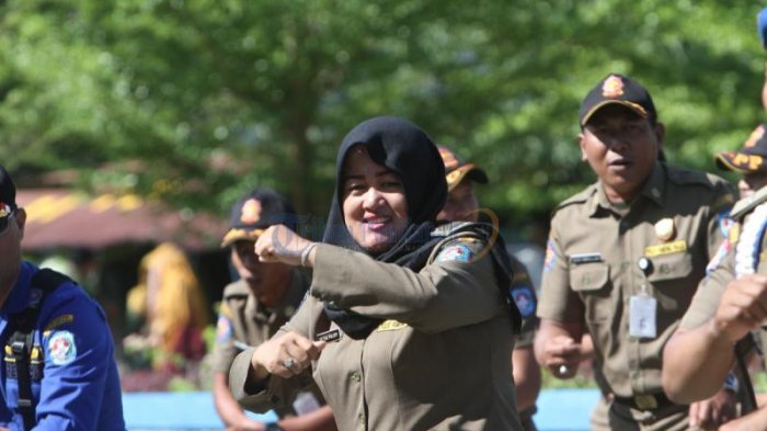 Sejumlah anggota Sat Pol PP menari bersama mengiringi lagu maumere usai apel memperingati hari jadi Sat Pol PP ke-68,