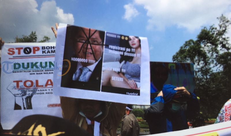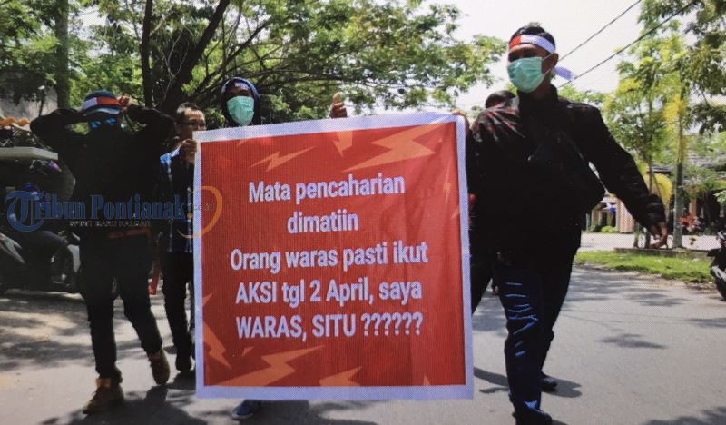 Aksi penolakan aturan pembatasan 1 NIK untuk 3 Kartu Perdana yang dilakukan Asosiasi Outlet dan Konter Seluler yang dimulai dari Bundaran Digulis Untan, Jalan Ahmad Yani, Pontianak, Kalimantan Barat, Senin (2/4/2018) siang. Puluhan warga yang berdemo ini rencananya akan melakukan long march menuju Kantor DPRD Provinsi Kalimantan Barat usai berorasi di Bundaran Digulis. TRIBUN PONTIANAK/DESTRIADI YUNAS JUMASANI