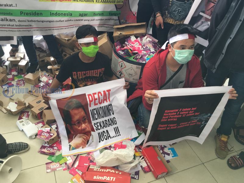 Peserta aksi menghamburkan kartu perdana bentuk protes terhadap kebijakan pemerintah dalam aksi penolakan aturan pembatasan 1 NIK untuk 3 Kartu Perdana yang dilakukan Asosiasi Outlet dan Konter Seluler di Kantor DPRD Provinsi Kalimantan Barat, Jalan Ahmad Yani, Pontianak, Kalimantan Barat, Senin (2/4/2018) siang. Peserta demo disambut oleh anggota Komisi I. TRIBUN PONTIANAK/DESTRIADI YUNAS JUMASANI