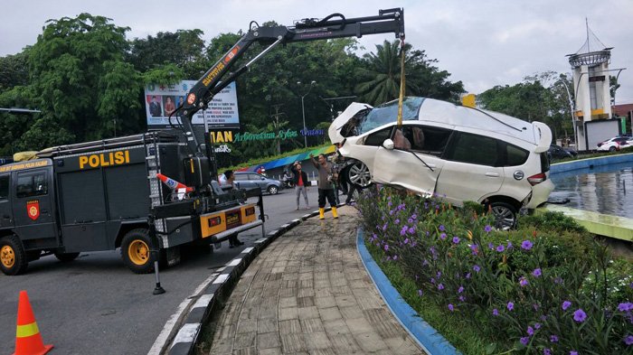 TRIBUNPONTIANAK.CO.ID PONTIANAK - Satlantas Polresta Pontianak beberkan identitas dan penyebab Kecelakaan tunggal yang dialami Honda Jazz putih hingga terjun ke kolam air mancur Tugu Digulis pada Jumat (6/4/2018) dini hari.