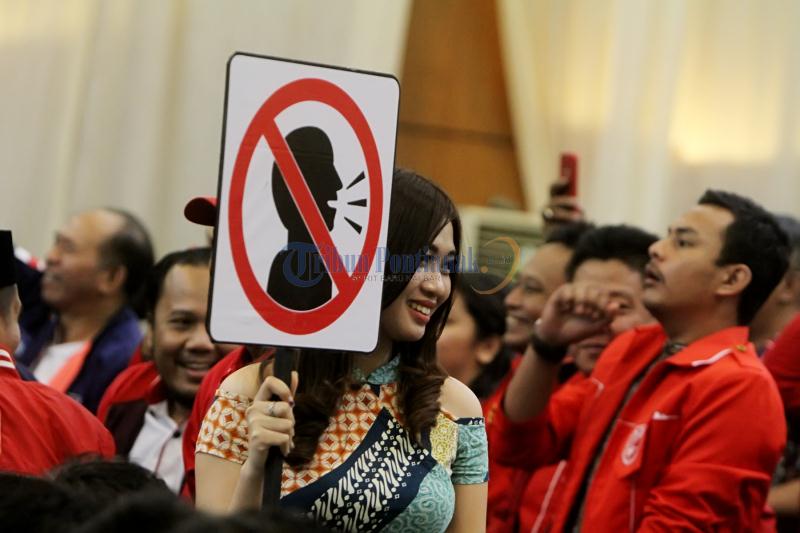 Satu di antara wanita yang bertugas menenangkan massa disela-sela istirahat pada debat publik putaran pertama antar pasangan calon Gubernur dan Wakil Gubernur Kalbar periode 2018-2023 di hotel Kapuas Palace, Pontianak, Sabtu (7/4/2018) pukul 19.30 WIB. Disela-sela istirahat, masing-masing pendukung paslon diberikan kesempatan untuk menyuarakan yel-yel kemenangan untuk paslon yang diusung.