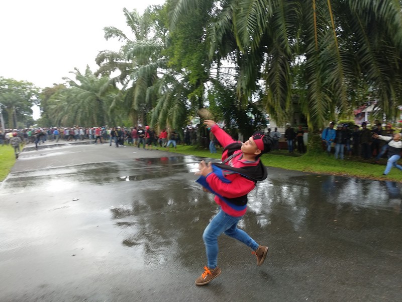 Lemparan batu dan kayu terus diarahkan ke anggota Polisi yang melakukan pengamanan, di dalam gedung DPRD Kabupaten Kapuas Hulu.