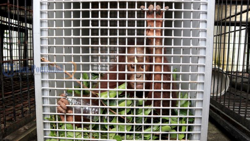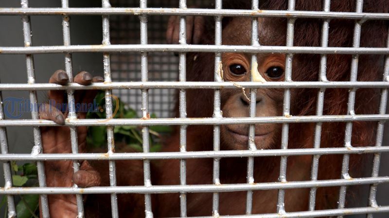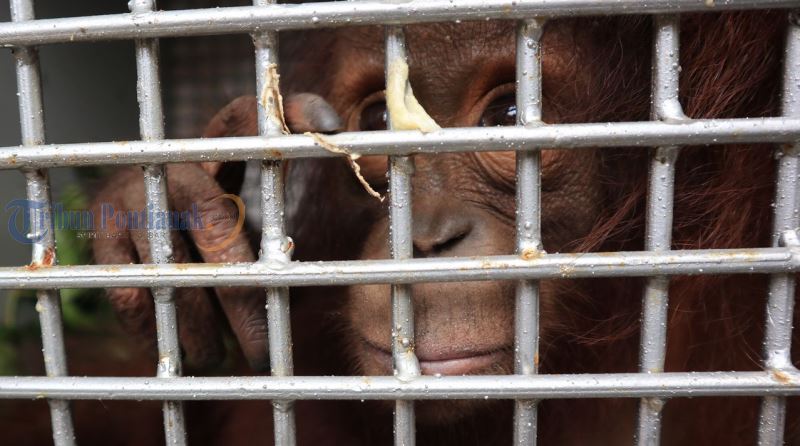 Satu individu orangutan yang diperkirakan berusia tiga tahun dan berkelamin betina diamankan ke kandang transit di Kantor BKSDA Kalbar, Jalan Ahmad Yani, Pontianak, Kalimantan Barat, Kamis (17/5/2018) siang. Pongo Pygmaeus tersebut ditemukan dan diamankan oleh anggota Polsek Sungai Kakap yang berpatroli tadi pagi dan melihat kerumunan warga yang melihat orangutan tersebut tidak jauh dari jembatan. TRIBUN PONTIANAK/DESTRIADI YUNAS JUMASANI