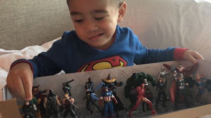 Dia duduk sambil memainkan sejumlah action figure dalam film Avenger: The Infinity War.