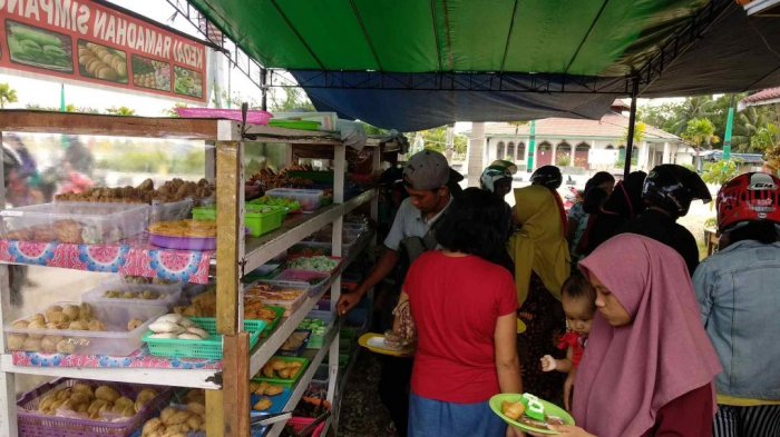 TRIBUNPONTIANAK.CO.ID, KAYONG UTARA - Gerai jajanan tradisional yang berada di dekat Tugu Durian, Sukadana, Kabupaten Kayong Utara disesaki warga, Jumat (18/5/2018).