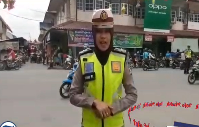 Traffic report pertama disampaikan oleh Kanit Turjawali Satlantas Polres Sambas, Ipda Tiwi Prabaningrum di Simpang Keramat, Sambas.