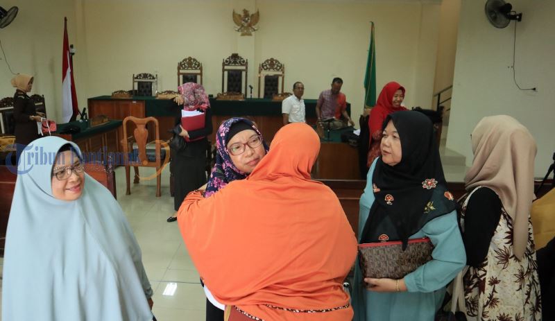 Yekti Kusumawati dipeluk rekannya usai sidang pembacaan putusan oleh Majelis Hakim atas dugaan Tipikor proyek pengadaan alat kesehatan (Alkes) Rumah Sakit Umum Daerah (RSUD) Sultan Syarif Mohamad Alkadrie Kota Pontianak Tahun 2012 digelar di Pengadilan Tipikor Pontianak, Jalan Uray Bawadi, Pontianak, Kalimantan Barat, Kamis (5/7/2018) siang. Yekti Kusumawati yang merupakan Pejabat Pembuat Komitmen (PPK) dan Direktur Utama PT Bina Karya Sarana Sugito masing-masing divonis tiga tahun penjara potong masa tahanan, sedangkan pemilik PT Bina Karya Sarana sekaligus Direktur PT Mitra Bina Medika Suhadi divonis enam tahun penjara potong masa tahanan. TRIBUN PONTIANAK/DESTRIADI YUNAS JUMASANI