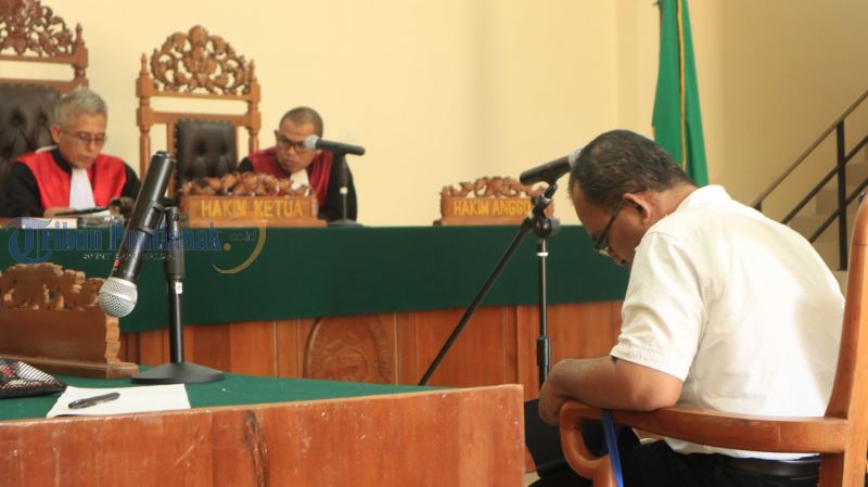 Sugito tertunduk mendengarkan pembacaan putusan oleh Majelis Hakim atas dugaan Tipikor proyek pengadaan alat kesehatan (Alkes) Rumah Sakit Umum Daerah (RSUD) Sultan Syarif Mohamad Alkadrie Kota Pontianak Tahun 2012 digelar di Pengadilan Tipikor Pontianak, Jalan Uray Bawadi, Pontianak, Kalimantan Barat, Kamis (5/7/2018) siang. Yekti Kusumawati yang merupakan Pejabat Pembuat Komitmen (PPK) dan Direktur Utama PT Bina Karya Sarana Sugito masing-masing divonis tiga tahun penjara potong masa tahanan, sedangkan pemilik PT Bina Karya Sarana sekaligus Direktur PT Mitra Bina Medika Suhadi divonis enam tahun penjara potong masa tahanan. TRIBUN PONTIANAK/DESTRIADI YUNAS JUMASANI
