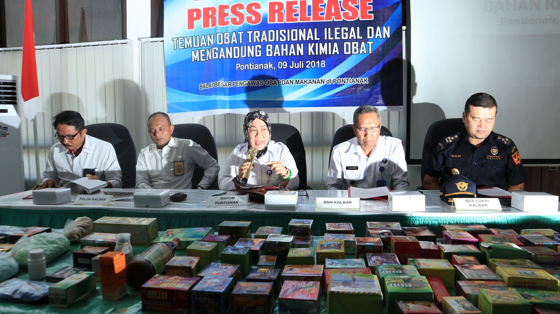 Kepala BBPOM di Pontianak Susan Gracia Arpan (berkerudung) menggelar press rilis terkait temuan obat tradisional ilegal dan mengandung bahan kimia obat di Kantor BBPOM di Pontianak di Jalan Dr Soedarso, Pontianak, Kalimantan Barat, Senin (9/7/2018) siang. Adapung hasil penindakan ini BBPOM di Pontianak beserta Polda Kalbar menyita 142 item obat tradisional dengan total 31080 kemasan.