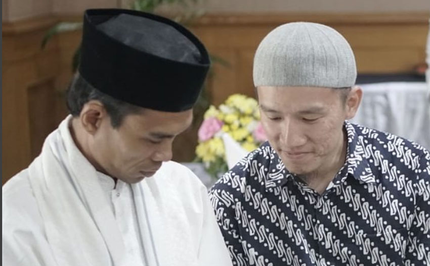 Jika Ustaz Felix Siauw mengenakan kemeja batik, Ustaz Abdul Somad mengenakan baju koko warna putih.