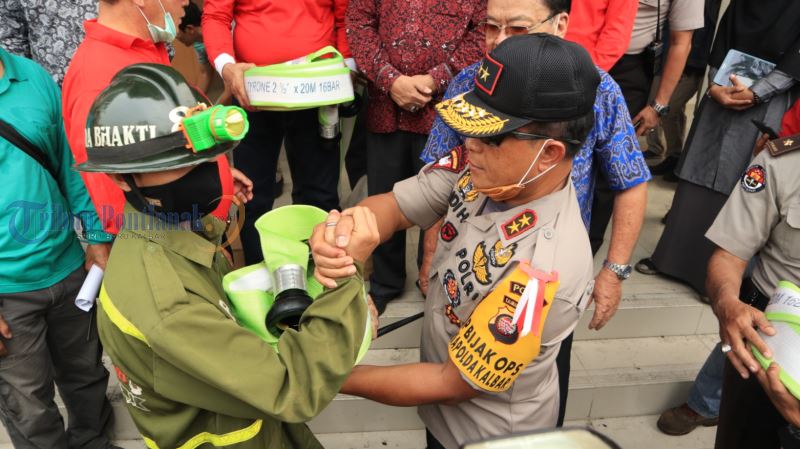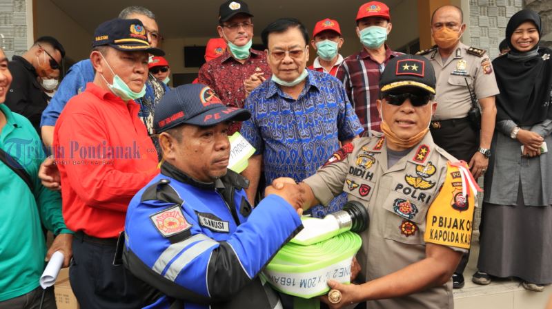 Yayasan Bhakti Suci melalui Kapolda Kalbar Irjen Didi Haryono menyalurkan bantuan 50 selang kepada pemadam kebakaran swasta untuk proses pemadaman kebakaran hutan dan lahan di Universitas Tanjungpura, Pontianak, Kalimantan Barat, Kamis (23/8/2018) siang. Walaupun tidak banyak, Kapolda berharap bantuan ini dapat sedikit membantu mengurangi meluasnya kebakaran lahan. TRIBUN PONTIANAK/DESTRIADI YUNAS JUMASANI