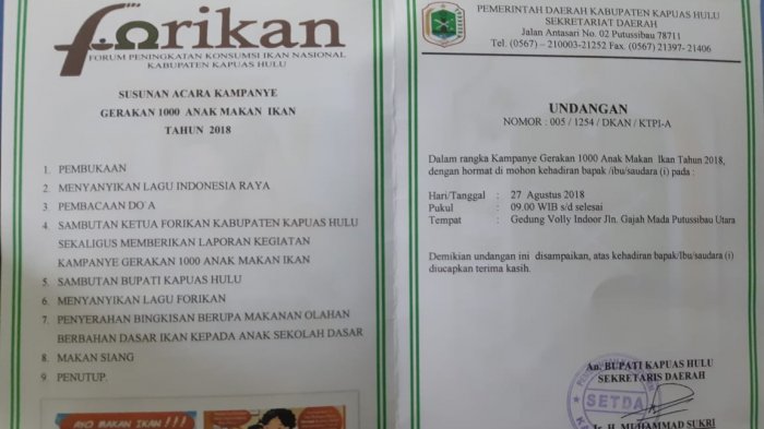 TRIBUNPONTIANAK.CO.ID, KAPUAS HULU - Hari ini, Senin (27/8/2018) pukul 09.00 WIB, ada kegiatan kampanye gerakan 1000 anak makan ikan tahun 2018, di Gedung Volly Indoor Putussibau, Jl Gajahmada Putussibau, Kecamatan Putussibau Utara.