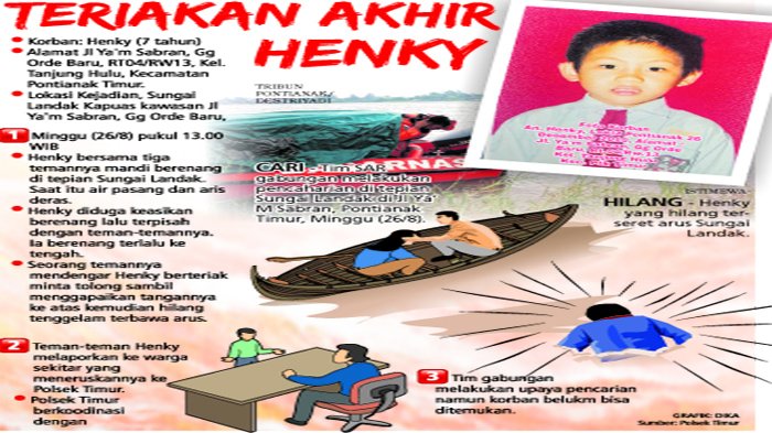 "Bocah laki-laki berusia tujuh tahun bernama Henky, diketahui hilang tenggelam di Sungai Landak yang airnya naik dan berarus deras," kata Kapolsek Pontianak Timur, Kompol Suhar.