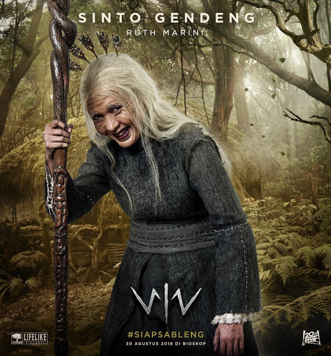 Memerankan Sinto Gendeng, Ruth tampil dengan warna kulit hitam keriput dan rambut putih panjang serta bibir dan gigi menghitam