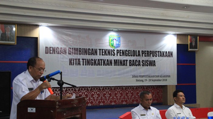 TRIBUNPONTIANAK.CO.ID, SINTANG - Asisten III Sekretariat Daerah Kabupaten Sintang bidang Administrasi Umum Marchues Afen membuka kegiatan Bimbingan Teknis Pengelolaan Perpustakaan Kabupaten Sintang di Aula CU Keling Kumang, Sintang Rabu (19/9/18) pagi.