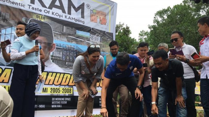 Bakal Calon Wakil Presiden Sandiaga Uno menyemen batako pertama peresmian Kopi Kampong sekaligus Hipmi Center