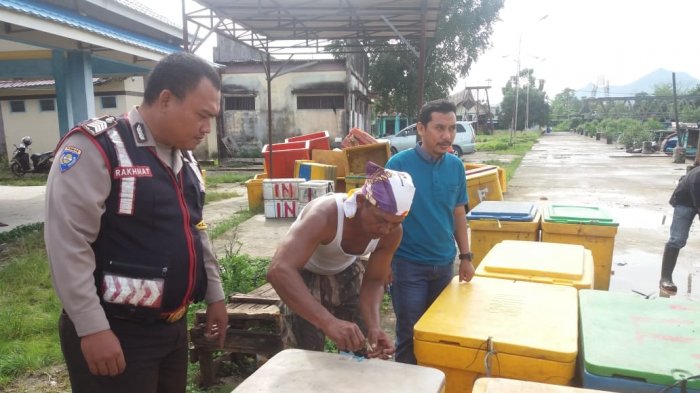 TRIBUNPONTIANAK.CO.ID, SINGKAWANG - Kepala perwakilan kantor PSDKP (Pengawasan Sumber Daya Kelautan dan Perikanan) Kota Singkawang, Danang bersama Bhabinkamtibmas Kelurahan Jawa, Bripka Rahmat melakukan pengecekan ikan yang datang dari pulau terluar ke Kota Singkawang, Jumat (12/10/2018).