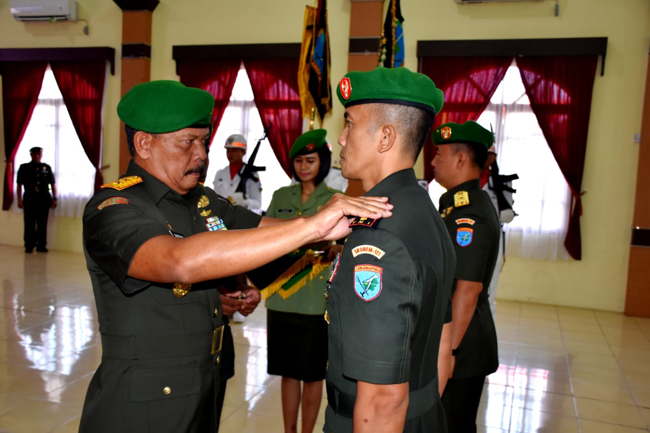 Caption: Panglima Kodam XII/Tanjungpura, Mayor Jenderal TNI Achmad Supriyadi memimpin Serah Terima Jabatan (Sertijab) dan Tradisi Penerimaan Serta Pelepasan Danrem 121/Alambhana Wanawwai di Aula Makorem 121/Abw, Jalan Pangeran Kuning, Sintang, Selasa (23/10/2018) pagi.