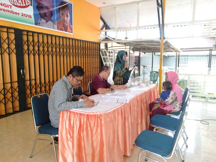 dr Doni Setiawan (Kemeja Kotak-kotak hitam putih) saat melakukan pemeriksaan kepada peserta sebelum pelaksanaan operasi bibir sumbing, Kamis (15/11/2018).