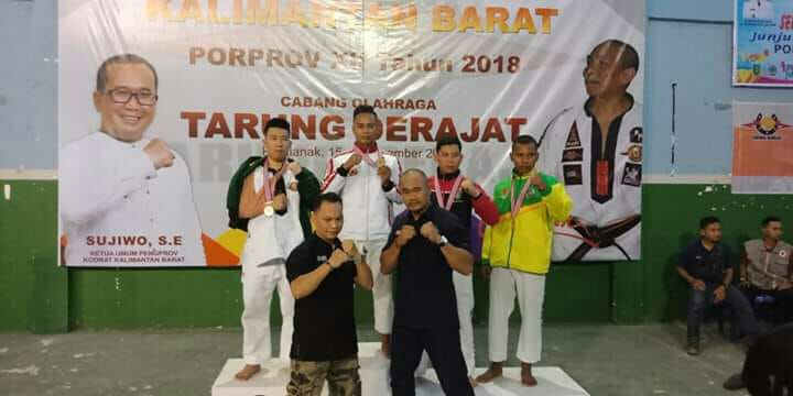 TRIBUNPONTIANAK.CO.ID, SINTANG- Anggota Kodim 1205/Sintang, Serda Mardiyanto Timor berhasil menyabet satu medali emas di cabang olahraga Tarung Derajat dalam ajang Porprov ke- XII Tahun 2018 di GOR STAIN Pontianak, Minggu (18/11/2018) kemarin.
