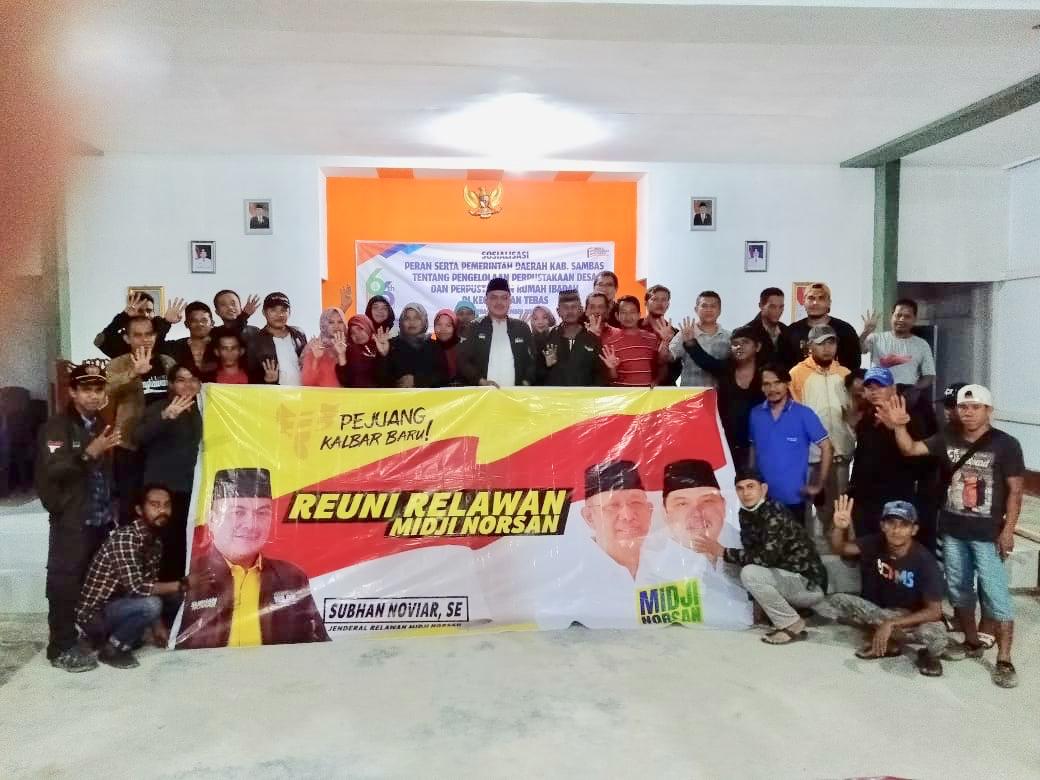 Reuni Relawan Midji Norsan ini diinisasi oleh Subhan Noviar, SE yang bertujuan untuk mendata kembali kondisi lapangan-yang nantinya-dari data tersebut akan diperoleh prioritas pembangunan di daerah tersebut.