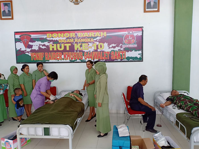 TRIBUNPONTIANAK.CO.ID, KAPUAS HULU - Masih dalam rangka memperingati HUT ke 10 Batalyon Infanteri RK 644/Wls, Batalyon yang dipimpin oleh Danyon RK 644/Wls Letkol Inf Gede Setiawan kembali mengadakan kegiatan sosial. Kali ini adalah melakukan Bhakti Sosial Donor Darah.