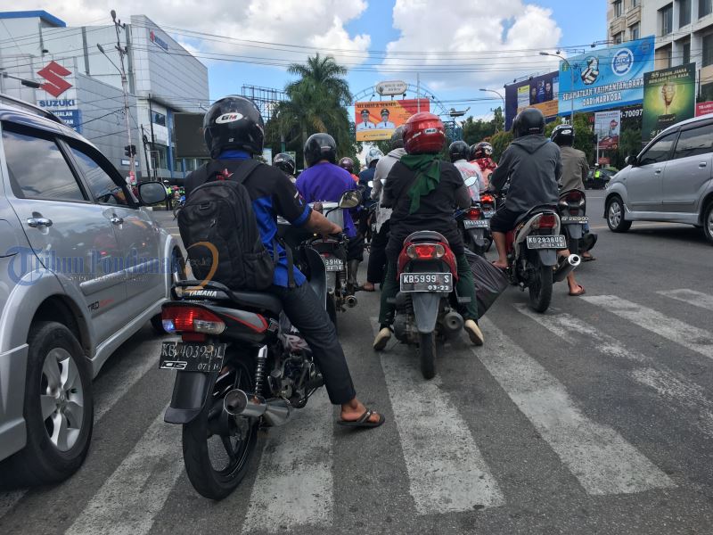 Kurangnya kesadaran pengendara yang masih berhenti di zebra cross saat menunggu lampu hijau di traffic light Jalan Pahlawan, Pontianak, Kalimantan Barat, Selasa (8/1/2019) siang. Padahal zebra cross adalah fasilitas yang diberikan untuk hak bagi pejalan kaki. TRIBUN PONTIANAK/DESTRIADI YUNAS JUMASANI
