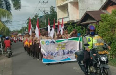 Para peserta Peringatan HUT Ke-53, SMPN 1 Teluk Keramat saat ikut Pawai Keliling dengan di kawal anggota Polsek Teluk Keramat.