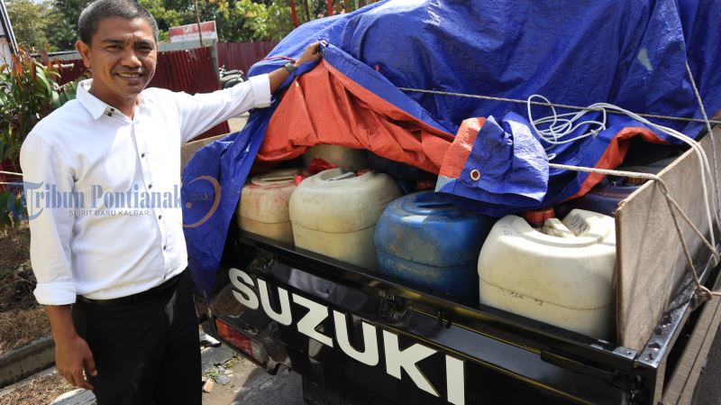 Kasat Reskrim Polresta Pontianak Kompol Muhammad Husni Ramli menunjukkan hasil tangkapan minyak oleh personel Jatanras atas penyalahgunaan niaga dan pengangkutan bahan bakar minyak yang disubsidi pemerintah di Mapolresta Pontianak, Jalan Johan Idrus, Pontianak, Kalimantan Barat, Rabu (16/1/2019) siang. Barang bukti berupa minyak jenis premium yang diamankan dari SPBU di Jalan Martadinata sebanyak 2625 liter BBM bersubsidi dari satu pelaku. TRIBUN PONTIANAK/DESTRIADI YUNAS JUMASANI