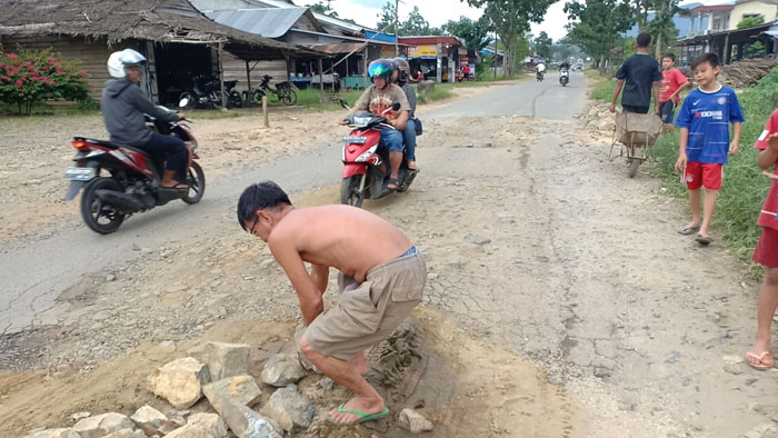 Warga Pajintan Singkawang Timbun Jalan Rusak dengan Batu