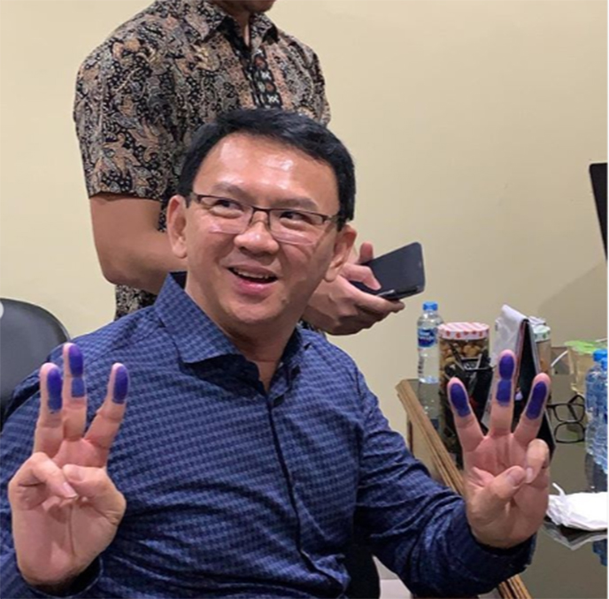 Momen ketiga, saat Ahok menunjukkan pose tiga jari yang sudah terkena tinta.