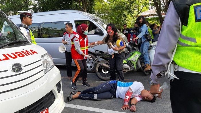 Saat simulasi dimulai sudah disiapkan peran masing-masing mahasiswa untuk menjadi korban dari tabrakan beruntun.