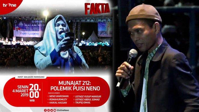 TRIBUNPONTIANAK.CO.ID - Program Fakta TVOne, malam ini, Senin (4/3/2019) mulai pukul 20.00 WIB mengangkat tema Munajat 212: Polemik Puisi Neno.