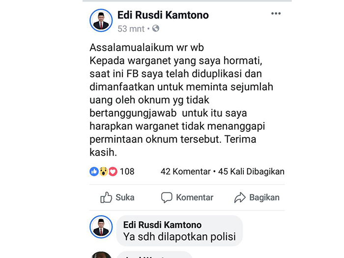 Akun Facebook dirinya bernama Edi Rusdi Kamtono telah diduplikasi dan melakukan aktivitas kriminal dengan meminta uang, sumbangan dan lainnya.