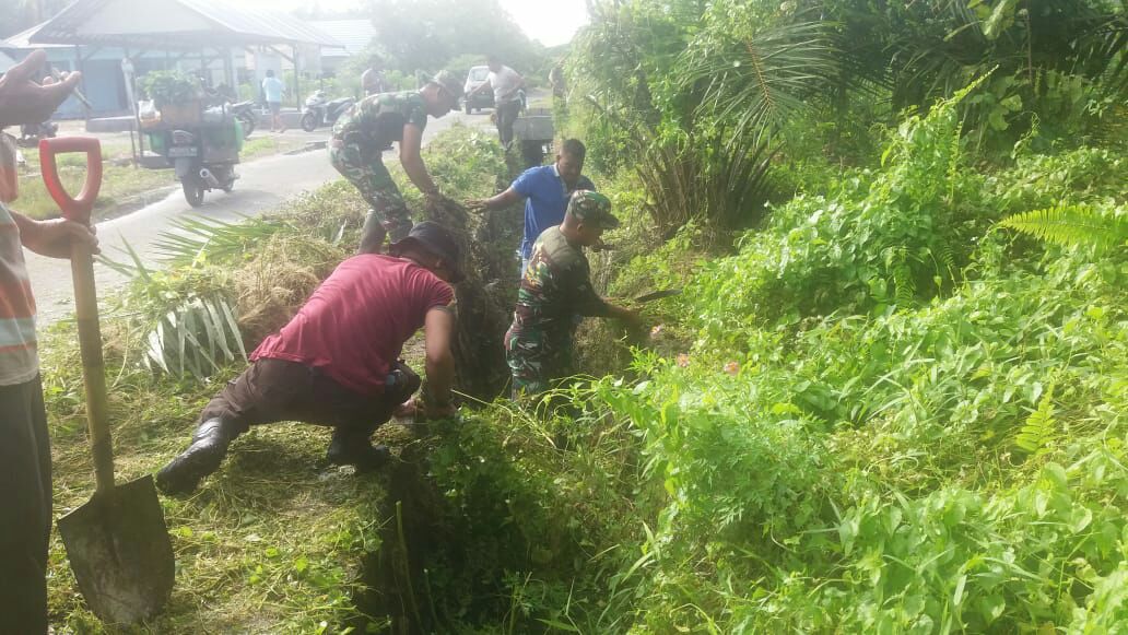 TRIBUNPONTIANAK.CO.ID, PONTIANAK - Anggota Kodim 1011/Kuala Kapuas melalui Koramil 1011-16/Bukit Rawi bersama dengan personel Polsek dan masyarakat melaksanakan gotong royong pembersihan lingkungan di Jalan Pertiwi Desa Bukit Rawi, Kecamatan Kahayan Tengah Kab. Pulang Pisau pada hari Senin (25/3/2019) kemarin.