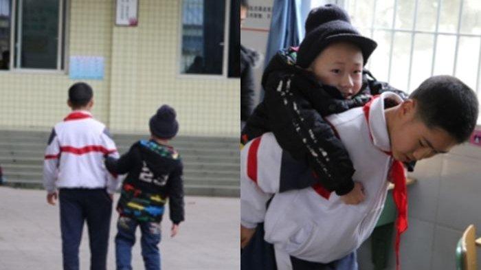 Bocah SD Tiap Hari Gendong Temannya yang Lumpuh ke Sekolah