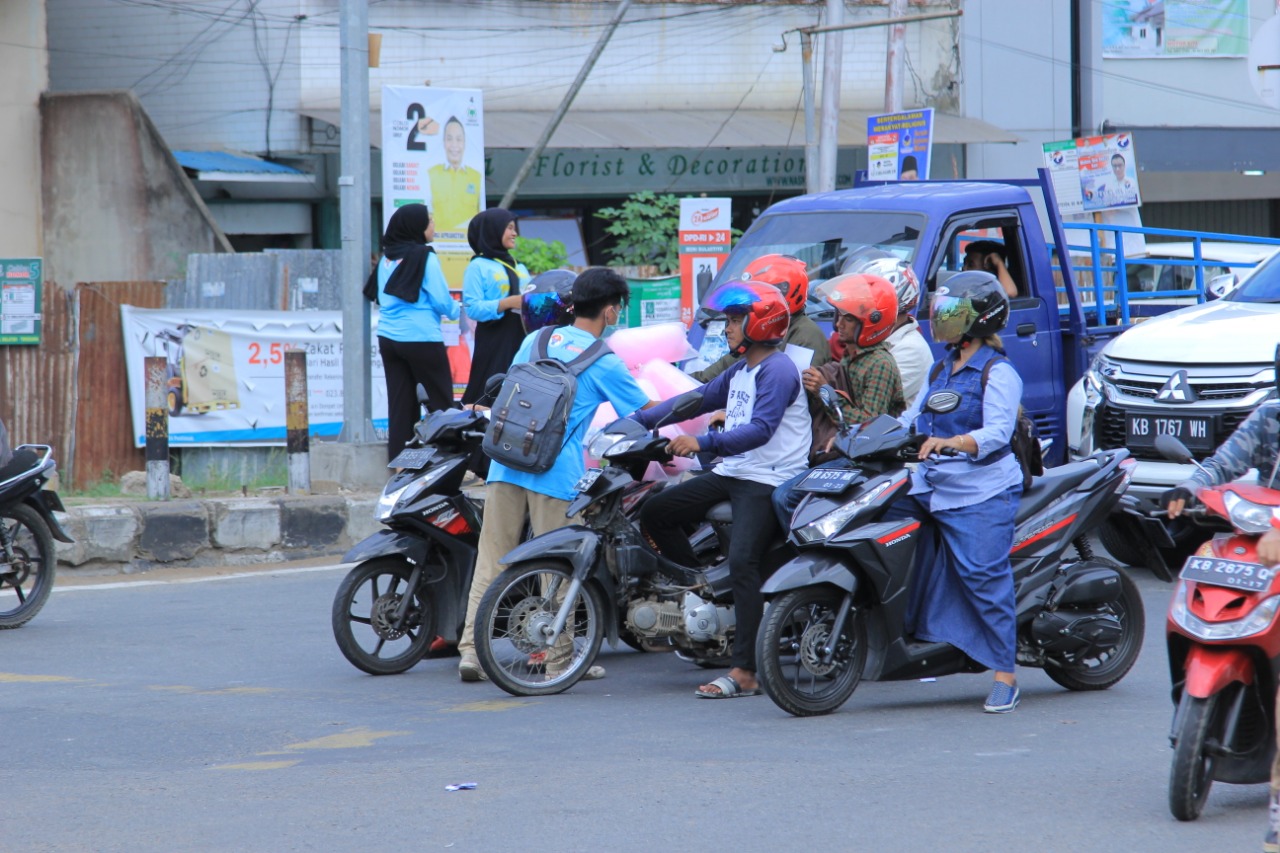 Para pengendara juga terlihat sangat koperatif, karena mereka disodori selebaran dengan iringan senyum renyah dari para relawan.