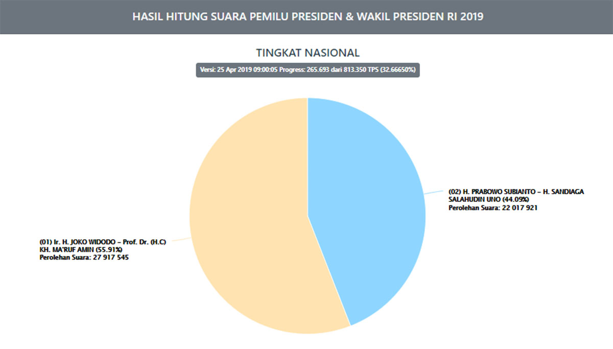 Komisi Pemilihan Umum (KPU) RI terus memperbarui real count atau hitungan nyata hasil sementara Pemilihan Umum (Pemilu) 2019 baik tingkat nasional maupun wilayah melalui Sistem Informasi Penghitungan Suara atau Situng KPU.